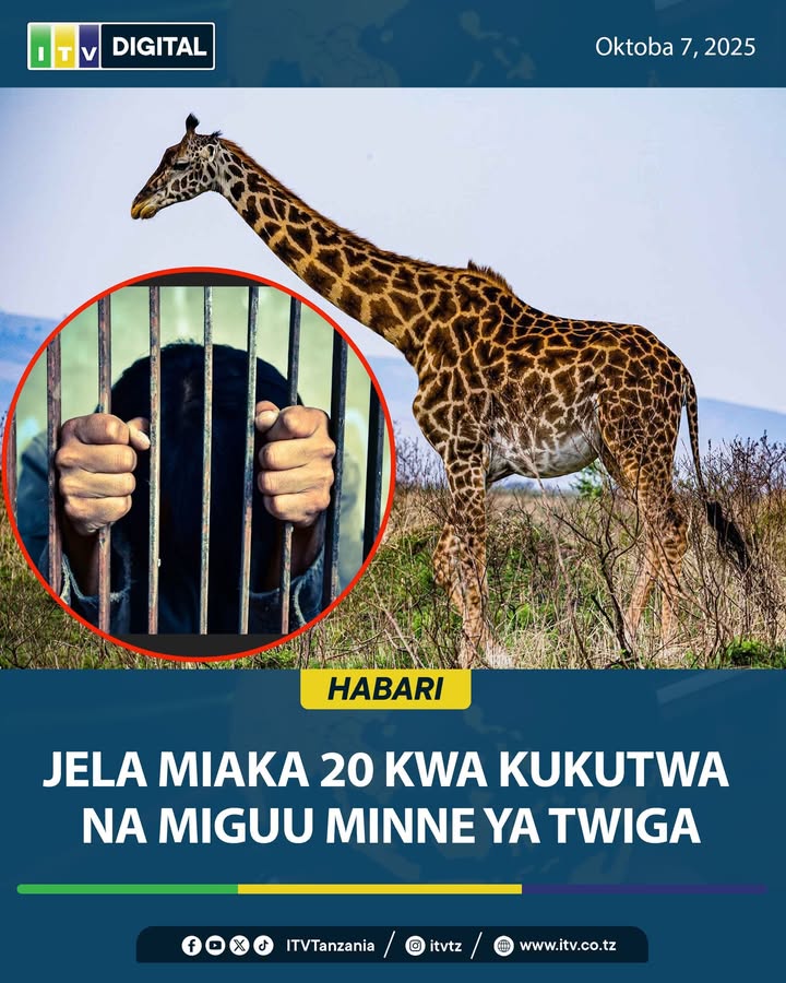 #HABARI: Mahakama ya Wilaya ya Kisarawe imemhukumu Athumani Bakari Mbagando kifungo cha miaka 20 Jela baada ya kutiwa hatiani kwa kukutwa na miguu minne ya Twiga, vipande 2 vya ngozi ya Twiga vyote vikiwa na thamani ya fedha za Tanzania Milioni hamsini na nne, laki sita, hamsini na moja elfu na mia nane.