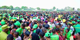Baadhi ya wananchi waliojitokeza katika uwanja wa Shule ya Sekondari Kizwite Manispaa ya Sumbawanga kusikiliza sera za mgombea urais kupitia Chama cha Mapinduzi CCM