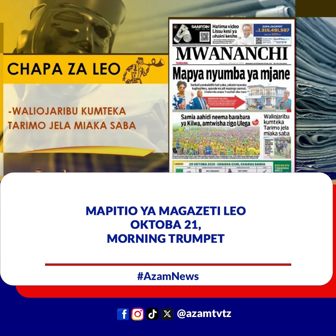 Mapitio ya #MAGAZETI leo Oktoba 21, 2025 kwenye #MorningTrumpet #UTV108 #AzamTVUpdates Post navigation 🔴KUMEKUCHA: UTATUZI WA CHANGAMOTO ZA WAFANYABIASHARA….OKTOBA 21, 2025 🔴KUMEKUCHA MICHEZO: … | OKTOBA 21, 2025