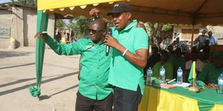 Mgombea udiwani kupitia CCM kata ya Endiamtu wilayani Simanjiro mkoani Manyara Lucas Zacharia Chimbason (kushoto) akinadiwa na mmoja wa waliokuwa watia Issa Katuga kwenye mkutano wa kampeni ya kuomba kura kwa wakazi wa eneo hilo. Picha na Joseph Lyimo