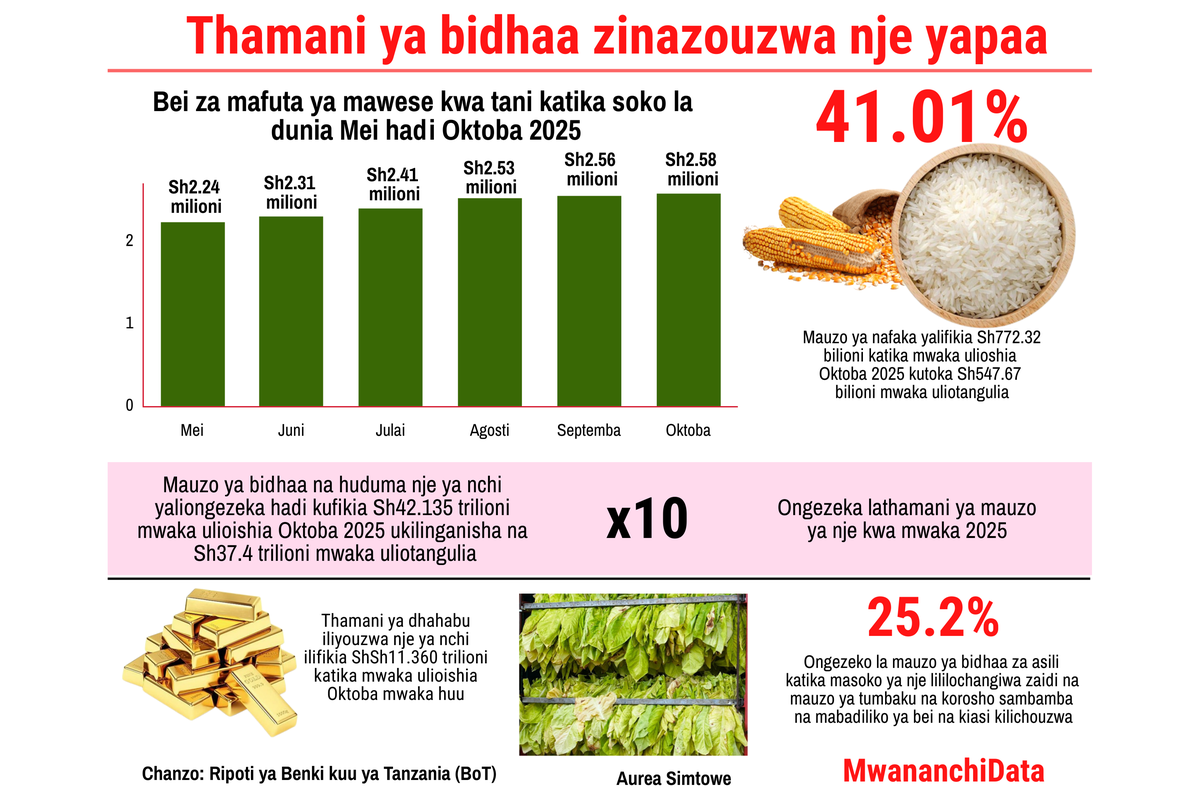 Kwa mwezi wa Oktoba 2025, mauzo ya bidhaa nje ya nchi yaliongezeka hadi dola za Marekani 949.2 milioni mwaka 2025, kutoka dola za Marekani 928.3 milioni Oktoba 2024, hali iliyochangiwa na ongezeko la mauzo ya dhahabu na bidhaa za viwandani.