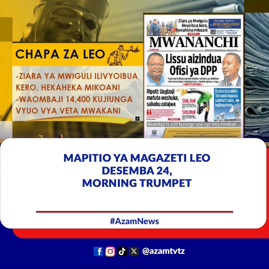 Mapitio ya #MAGAZETI leo Desemba 24,2025 kwenye #MorningTrumpet #UTV108 #AzamTVUpdates Post navigation 🔴#KUMEKUCHA: DISEMBA 24, 2025 #HABARI: Waziri mkuu wa Libya amesema, mkuu wa jeshi la Libya amefariki katika ajali ya ndege nchini Uturuki