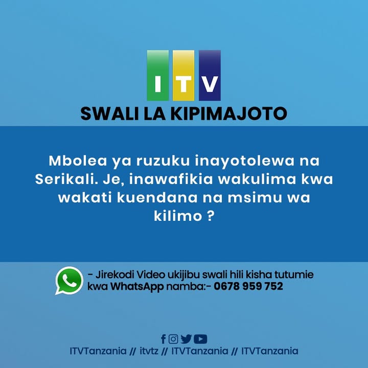 Mbolea ya ruzuku inayotolewa na Serikali. Je, inawafikia wakulima kwa wakati kuendana na msimu wa kilimo ? Post navigation 🔴TAARIFA YA HABARI YA ASUBUHI…..DISEMBA 28, 2025 🔴 #ITVMAGAZETINI: CHANZO CHA MVI MAPEMA HIKI HAPA- 28 DISEMBA 2025
