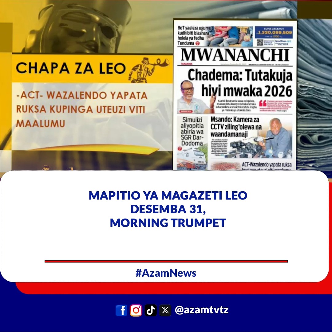 Mapitio ya #MAGAZETI leo Desemba 31,2025 kwenye #MorningTrumpet #UTV108 #azamtvupdates Post navigation đź”´#KUMEKUCHA: SALAMU ZA JESHI LA POLISI KUELEKEA MWAKA MPYA….DISEMBA 31, 2025