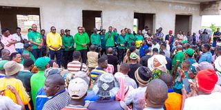 Wananchi na baadhi ya viongozi wa chama na serikali wakisikiliza maelekezo ya Katibu wa Nec,Itikadi,Uenezi na Mafunzo Kenani Kihongosi katika mradi wa shule mpya ndani ya Shule ya Msingi Iborogero