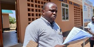 Mganga mkuu wa Wilaya ya Moshi, Dk Juma Mombokaleo akisoma taarifa ya ujenzi wa zahanati ya Ghona iliyojengwa katika Kijiji cha Ghona, Kahe Mashariki, Wilaya ya Moshi. Picha na Janeth Joseph
