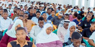 Wanafunzi kutoka vyuo mbalimbali Zanzibar wakiwa kwenye kongamano la kuhusu elimu ya Muungano kwa wanafunzi wa vyuo vikuu vya Zanzibar lililofanyika Chuo Kikuu cha Taifa (Suza).