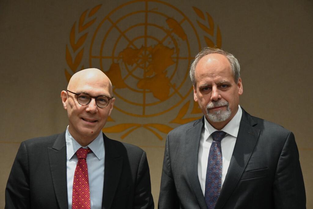 Wanaume wawili waliovaa suti wamesimama mbele ya nembo ya Umoja wa Mataifa. Mmoja ni mvivu na miwani na tai nyekundu, mwingine ana ndevu kijivu na tai ya bluu.