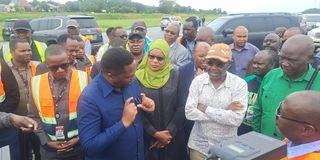 Mkuu wa Mkoa wa Mara, Kanali Evans Mtambi akieleza jambo kwa Waziri wa Uchukuzi Profesa Makame Mbarawa alipofanya ziara kwenye mradi wa ujenzi wa uwanja wa ndege Musoma.  Picha na Beldina Nyakeke