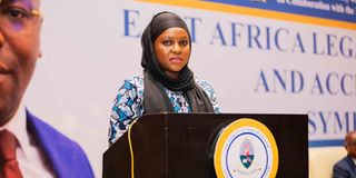 Naibu Waziri Wizara ya  Katiba na Sheria Zainab Katimba akizungumza wakati wa kongamano la Afrika Mashariki kuhusu matumizi ya teknolojia katika mifumo ya utoaji haki.